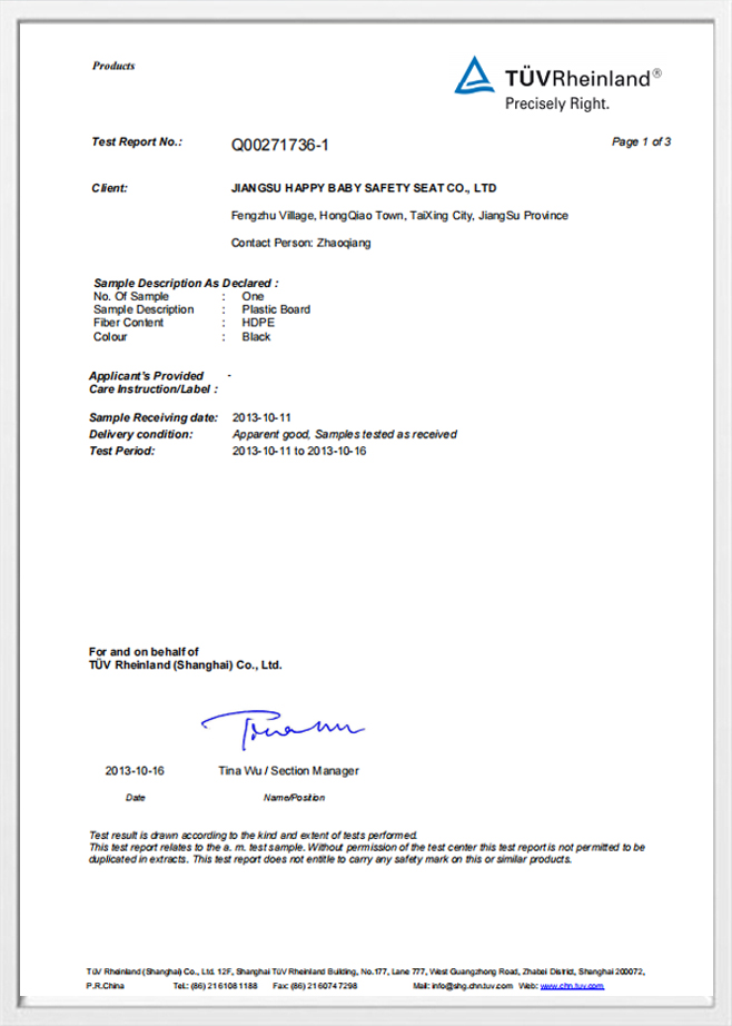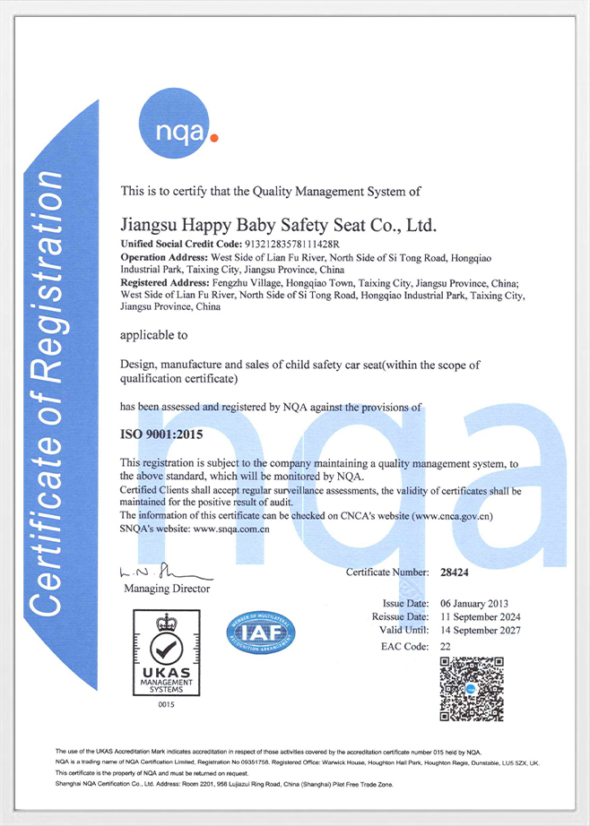 Sa larangan ng kaligtasan sa paglalakbay ng bata, ang ebolusyon ng mga pamantayan ay kumakatawan sa pagpapalalim ng pag-unawa ng tao sa mga agham ng buhay. JIANGSU HAPPY BABY SAFETY SEAT CO., LTD. lubos na naniniwala na ang mga upuan sa kaligtasan ng bata ay hindi lamang isang hanay ng mga pamantayan o isang sertipikasyon, ngunit isang responsibilidad at pangako. Bilang isang pinagkakatiwalaang tagapag-alaga para sa mga pamilya sa buong mundo, naiintindihan namin na ang pagsilang ng bawat upuan ay isang pag-unawa sa pamilya at isang paggalang sa buhay.